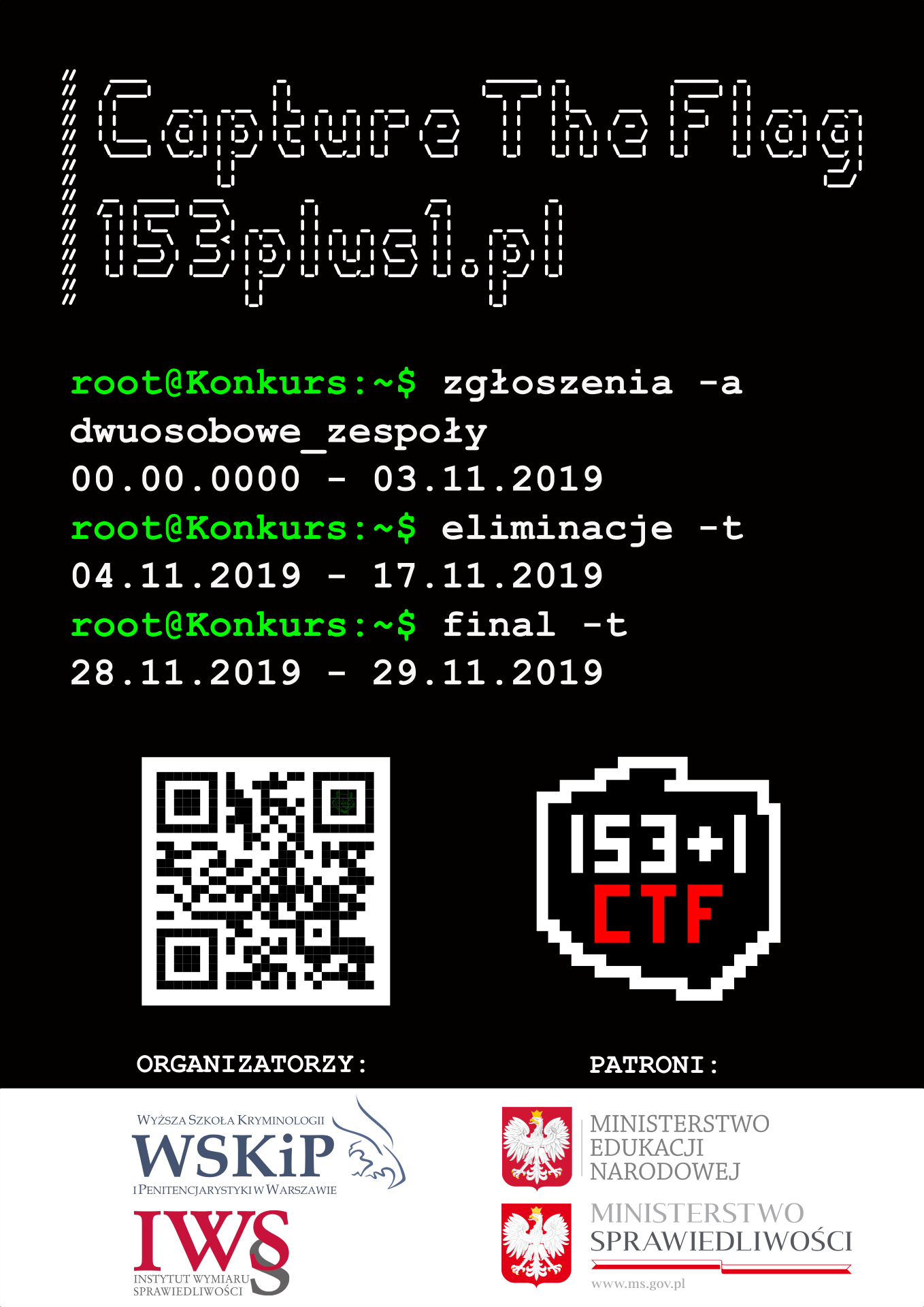 Ministerstwo Edukacji Narodowej zachęca do udziału w konkursie Capture The Flag „153+1” organizowanym przez Instytut Wymiaru Sprawiedliwości. Przedsięwzięcie jest skierowane do uczniów publicznych i niepublicznych szkół ponadpodstawowych, w szczególności uczniów techników oraz szkół branżowych o profilu informatycznym. Celem konkursu jest rozwijanie zainteresowania tematyką cyberbezpieczeństwa w atrakcyjny i przystępny dla młodych ludzi sposób.